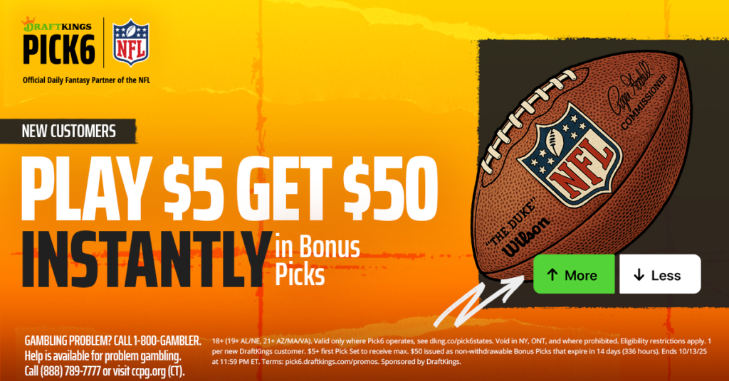 If you sign up for DraftKings Pick6 via links on our site, we may earn an affiliate commission.