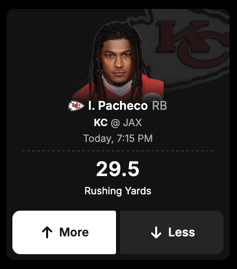 Isaiah Pacheco MORE THAN 29.5 Rushing Yards