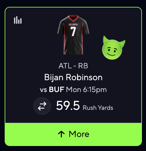 After a shaky Week 1, Robinson has really found his rhythm, going over this line in 3 straight games and averaging just under 97 rushing yards per contest during that stretch. He’s now facing a Bills defense that has struggled mightily against the run, allowing 5.6 yards per carry — tied for the second-worst mark in the league. With that kind of matchup and his recent form, Robinson should have no trouble finding running lanes, and this discounted number feels like a gift.