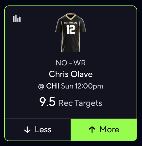 Olave has been an absolute target magnet this season, drawing double-digit looks in five of six games and serving as the clear focal point of the Saints’ passing attack. He now faces a Bears defense that’s been middle-of-the-pack against the pass and enters as a 3.5-point home favorite — a setup that should force New Orleans to lean heavily on its aerial game. With volume on his side and his connection with the quarterback stronger than ever, Olave is poised for another busy and productive outing.
