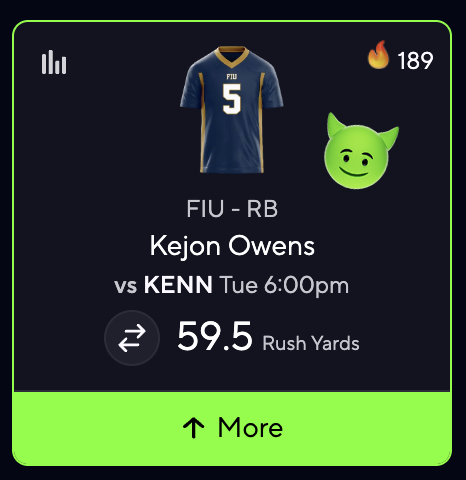 Owens has been remarkably consistent this season, going over this number in every game while averaging more than 100 rushing yards per contest. He now draws a favorable matchup against a Kennesaw State defense that’s been just average against the run, giving up over 4 yards per carry. With his reliable workload — typically at least 15 carries per game — Owens should once again find plenty of running room. Sixty-five yards feels like his absolute floor here, making this a great spot for him to continue his dominant stretch.