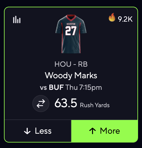 Buffalo comes into this matchup ranked 31st in defensive rushing efficiency, giving up a hefty 5.4 yards per carry, and teams have been exploiting that weakness all season. With C.J. Stroud sidelined, Woody Marks has stepped into a true workhorse role, handling 14 and 18 carries in his last two games. On a short week with a backup quarterback under center, it makes perfect sense for Houston to lean heavily on the ground game and keep the ball out of Buffalo’s hands. Given the matchup, volume, and game script, this spot sets up beautifully for Marks to put together a big performance.