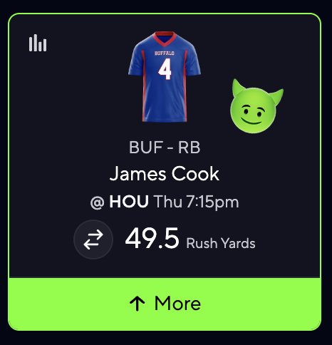 Cook has cleared this number in 7 of 10 games this season—and in every single game where he’s logged at least 17 carries—which shows how safe this lower line is when he gets his usual workload. The Bills enter tonight as 6-point road favorites in Houston, and while the Texans boast a strong overall defense, this particular number feels far too modest for a player with Cook’s usage and efficiency. Buffalo should look to control the tempo, sustain drives, and lean on their explosive RB to keep the pressure off the passing game. Given the matchup, projected game script, and Cook’s consistent production, this alt line is an excellent spot to target.